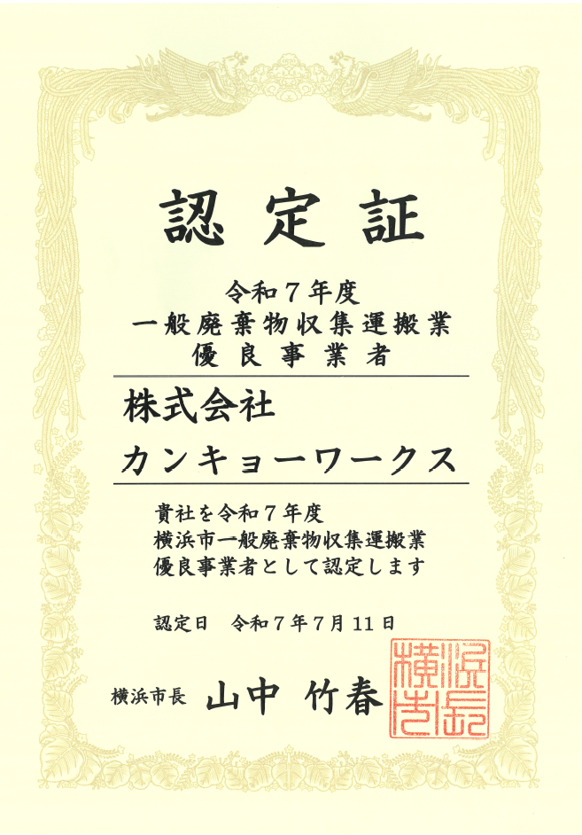 このたび、令和7年度においても、横浜市より一般廃棄物収集運搬業の「優良認定」を頂くことができました。